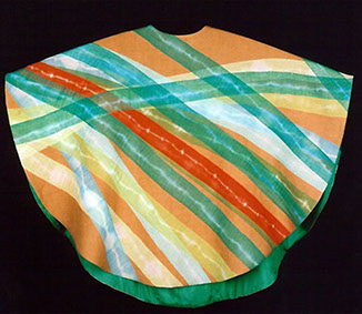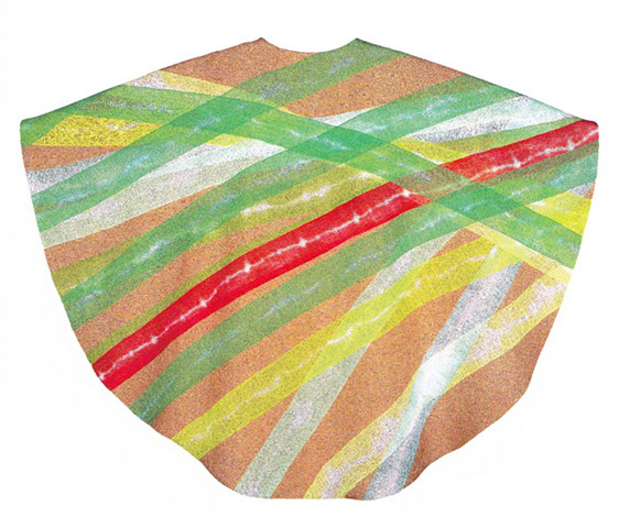 Eingefärbte Gaze-Streifen, grün dominiert, auf Rupfen-Wollgewebe.