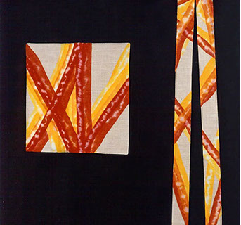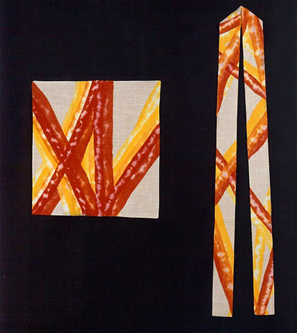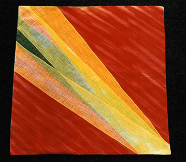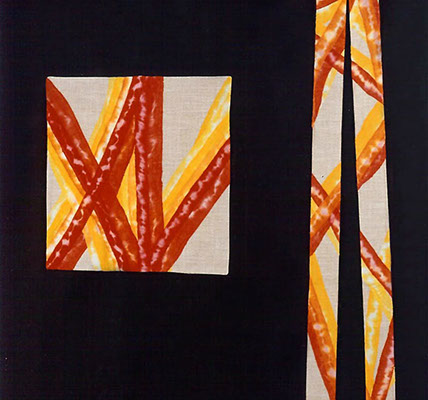 Gefärbte Gaze-Streifen, rot dominiert, auf Rupfen-Wollgewebe.