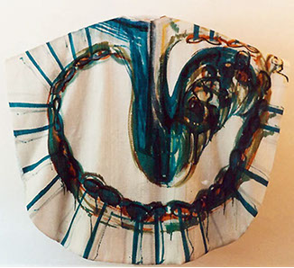 Doupionseide und historische Paramentenstoffe, bemalt, Konturen in Japangold gestickt.