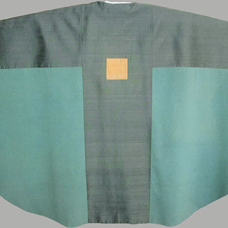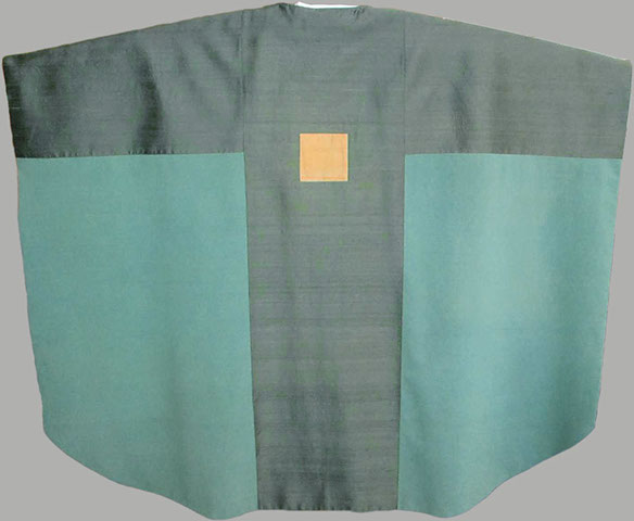 grüne mit goldfarbener Seide kombiniert und mit blauer Applikation akzentuiert,
