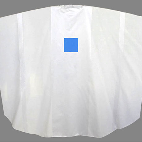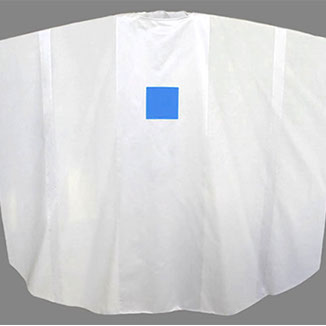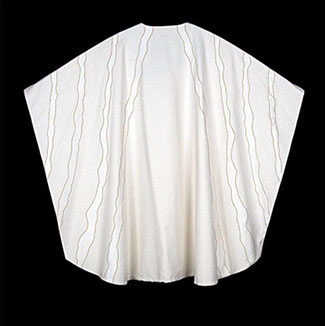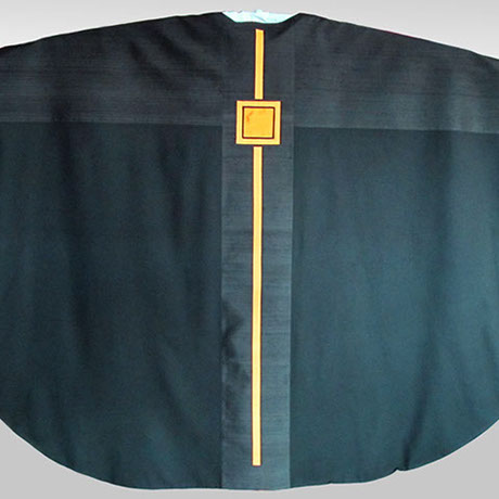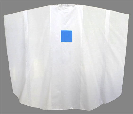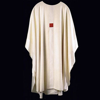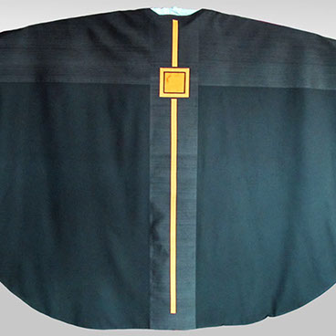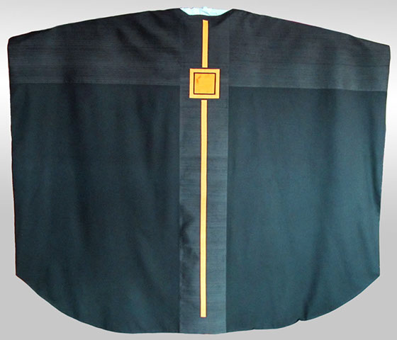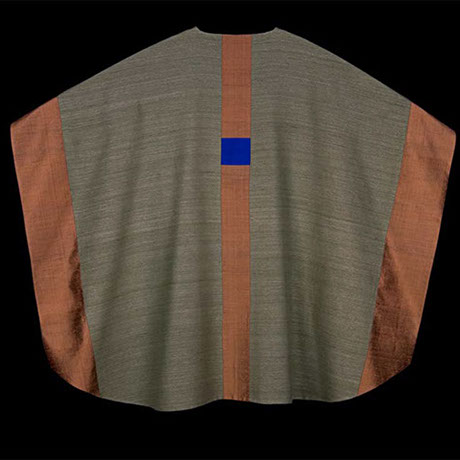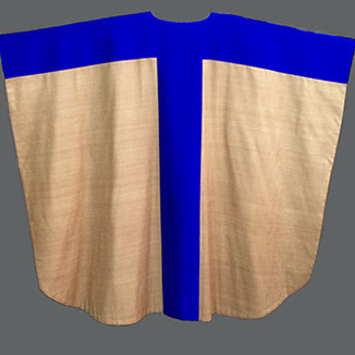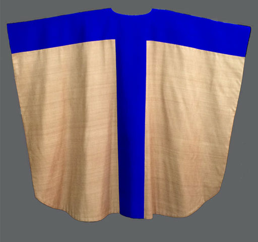 Casel, 2014, Bouretteseide mit appliziertem blauen Taukreuz in Doupion, Paramentenhaus Wefers Köln